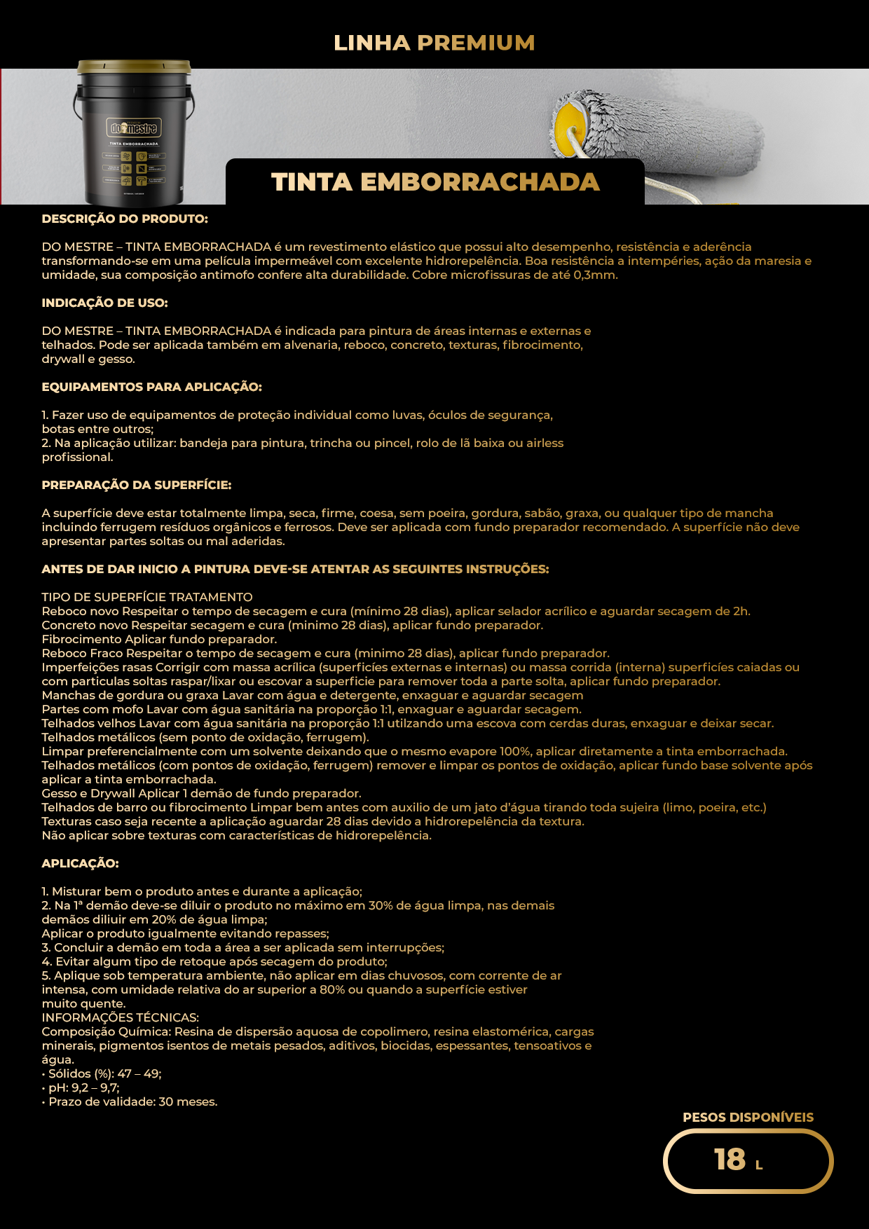 DO MESTRE – TINTA EMBORRACHADA é um revestimento elástico que possui alto desempenho, resistência e aderência transformando-se em uma película impermeável com excelente hidrorrepelência. Boa resistência a intempéries, ação da maresia e umidade, sua composição antimofoconfere alta durabilidade. Cobre microfissuras de até 0,3mm.