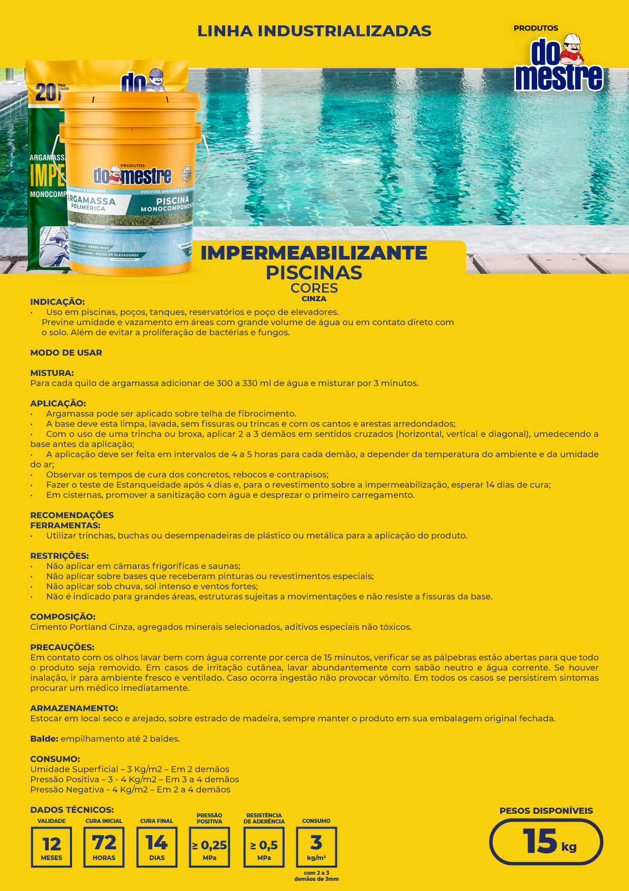 - Consumo: 3 kg/m² com 2 a 3 demãos de 3mm.