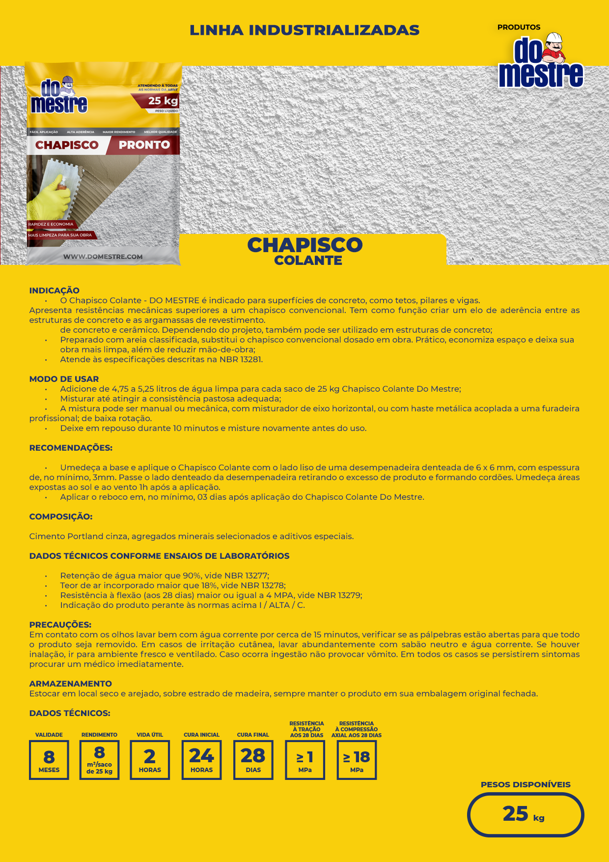 Rendimento: 1,38 m²/saco de 25 kg para cada cm de espessura